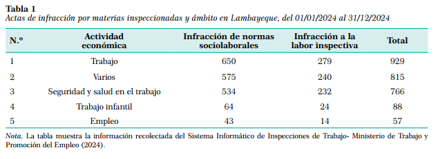 El análisis desarrollado se sustenta en un estudio detallado de la función inspectora, considerando tanto su marco normativo como su aplicación práctica en Lambayeque. Se examina el panorama empresarial regional y su relación con la fiscalización laboral, resaltando la importancia de contar con un sistema de inspección eficiente que permita intervenir en sectores críticos y atender problemáticas recurrentes. Así mismo, se presentan y analizan cifras oficiales proporcionadas por la Intendencia Regional de la Superintendencia Nacional de Fiscalización Laboral (SUNAFIL) en Lambayeque, obtenidas a través de la actual gestión, las cuales permiten evaluar la dinámica de las inspecciones y su impacto en la defensa de los derechos sociolaborales. Estas cifras son abordadas en diferentes secciones del artículo con el fin de ofrecer una visión integral del estado actual de la inspección laboral y sus resultados en la región.