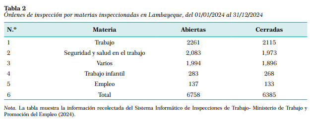 En el año 2024, la SUNAFIL registró a nivel de Lambayeque un total de 6758 órdenes de inspección abiertas, finalizando el año con 6385 órdenes cerradas. Por tanto, se puede observar que se cuenta con materias de inspección, como “trabajo”, enfocada en derechos laborales, como salarios o beneficios sociales, entre otros, que cuenta con 146 órdenes de inspección pendiente. En cuanto a la “seguridad y salud en el trabajo” esta materia verifica que se cumplan condiciones seguras en el lugar de labores, que se utilicen equipos de protección personal, que se cumpla con medidas de prevención de riesgos, entre otros aspectos, y cuenta, por su parte, con 110 órdenes pendientes. Así mismo, “trabajo infantil”, con 15 órdenes pendientes; “empleo”, referido a temas como inclusión laboral, tiene 4 pendientes; y “varios”, que toma aspectos que no son incluidos en materias específicas, con 98 órdenes de inspección pendientes. En conjunto, hacen un total de 373 órdenes de inspección en espera en la región, al concluir el año 2024, de acuerdo con el reporte de SUNAFIL.