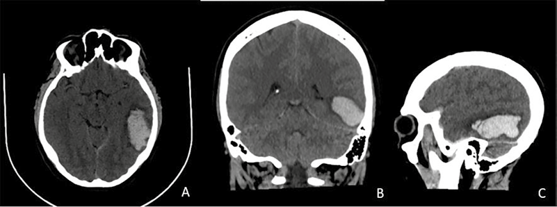 de área hiperdensa rodeada de edema pelilesional, localizada en región subcortical que se extiende a la sustancia blanca del lóbulo temporal izquierdo. La lesión mide 5,4 x 2,7 x 2,8 cm con un volumen de 21,3 cc.