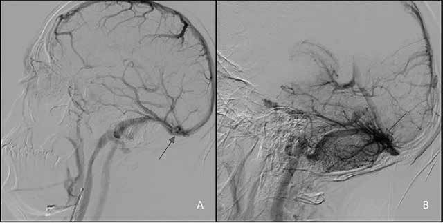 describe una MAV fistulosa compleja temporo-occipital izquierda dependiente de ramas de arteria cerebral media, tratada con embolización transarterial. La importancia de reportar