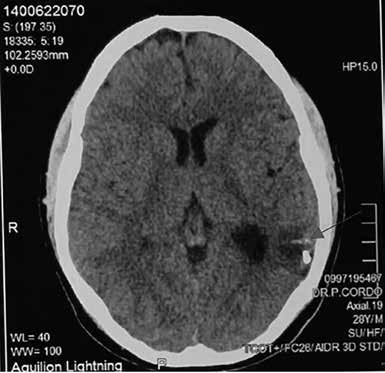 tres meses, en la tomografía el paciente presenta reabsorción total de hemorragia intraparenquimatosa causada por MAV; sin embargo, existe presencia de una pequeña área de