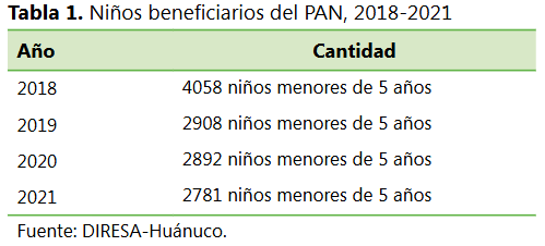 En consecuencia, el ámbito geográfico de este estudio fue el distrito de Panao (capital de la provincia de Pachitea), que en el año 2019 tuvo una tasa de desnutrición crónica infantil del 19,8 %. En dicha jurisdicción, la Micro Red de Salud de Panao es la encargada de la implementación del PAN. Sin embargo, se debe mencionar que en comparación con el período 2001-2011, en los últimos años la tasa de desnutrición crónica infantil ha experimentado una reducción significativa, hecho que se puede asociar con la implementación de programas sociales (9).