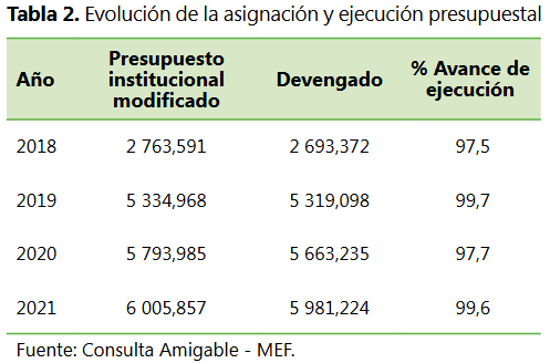 Al analizar las dimensiones "asignación presupuesta" (medido a través del presupuesto institucional modificado) y "ejecución presupuestal" (medido a través del gasto devengado y el porcentaje de avance de ejecución) del PAN perteneciente a la Micro Red de Salud de Panao. Se puede apreciar que el presupuesto asignado se ha incrementado sostenidamente en el tiempo. Del mismo, se aprecia que el porcentaje de avance de ejecución presupuestal ha mantenido niveles elevados; en particular, en el año 2021 dicho porcentaje fue del 99,6 %. Lo anterior nos indica que la Micro Red de Salud de Panao ha incrementado sus recursos para la promoción y provisión de los productos y servicios que ofrece el PAN (ver Tabla 2).