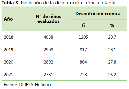 En relación con la evolución del porcentaje de niños menores de cinco años que padecen de desnutrición crónica que se atienden en la Micro Red de Salud de Panao, se aprecia que la tasa de desnutrición crónica infantil ha mostrado una tendencia a la baja, pasando de 29,7 % en el año 2018 a 26,2 % en el año 2021 (ver Tabla 3).