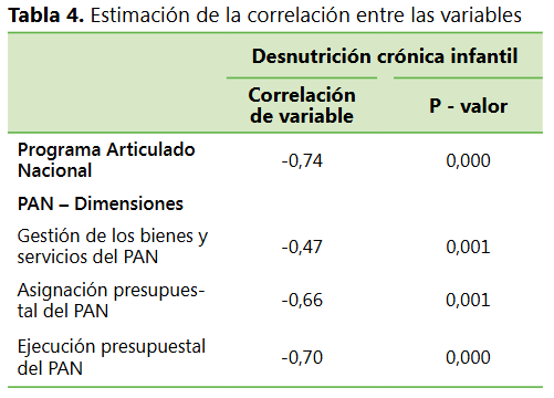 Respecto a la estimación del coeficiente de correlación de Pearson entre el PAN y la desnutrición crónica infantil en niños menores de cinco años, se aprecia una relación negativa fuerte entre las variables en estudio, con un coeficiente de correlación de Pearson de -0,74. Así mismo, se halló una relación negativa entre la tasa de desnutrición crónica infantil y las dimensiones del PAN: "gestión de los bienes y servicios" del PAN (coef. de Pearson = -0,66), "asignación presupuestal" del PAN y "ejecución presupuestal" del PAN (coef. de Pearson = -0,70) (ver Tabla 4).
