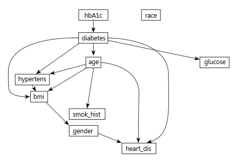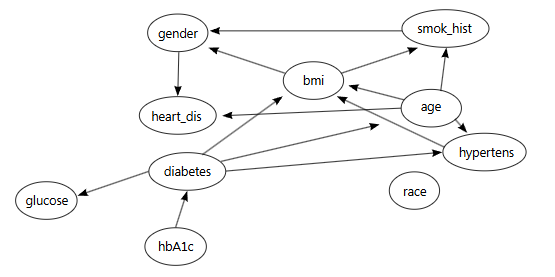 Con el aprendiz TAN–Chow–Liu fue generado un árbol que situó al IMC en la raíz, desde la cual se irradiaron tres trayectorias epidemiológicas: historia de tabaquismo, IMC y sexo, capturándose patrones de consumo específicos por sexo, edad, IMC e hipertensión, lo que refleja el aumento de la presión arterial mediado por el peso y el envejecimiento; así mismo, el IMC hacia la enfermedad cardíaca y, finalmente, la diabetes, considerada una cascada cardio-metabólica canónica. La glucemia sostenida (HbA1c) fue modelada como entrada directa a la diabetes, mientras que la glucosa y la raza/etnia permanecieron aisladas, lo que sugiere que, en esta cohorte, la exposición crónica constituye una señalmás robusta que una medición aislada de glucosa y que la variabilidad étnica sería negligible (ver Figura 2).