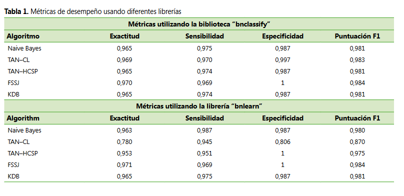 A pesar de sus diferencias estructurales, todos los clasificadores superaron una exactitud de 0,96 tras la validación cruzada. El FSSJ encabezó con una aproximación de 0,97 de exactitud y especificidad perfecta, mientras que Naive Bayes, TAN–HCSP y KDB ofrecieron un desempeño alto y estable. El TAN–CL resultó más sensible a las idiosincrasias de los datos, aunque permitió identificar nuevas rutas causales. Estos resultados confirman que, cuando las relaciones entre variables son sencillas, las arquitecturas bayesianas básicas pueden igualar a variantes más elaboradas. Aun así, las herramientas de aprendizaje de estructura, como bnlearn, siguen siendo indispensables para extraer conexiones clínicamente interpretables, aportando conocimientos que pueden orientar estrategias de prevención focalizadas más allá de lo que comunican las métricas escalares de desempeño.