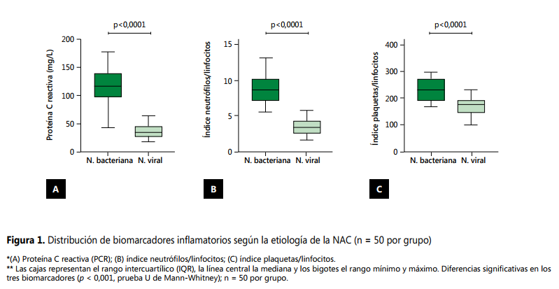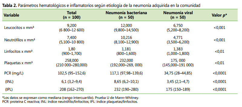 Palabras clave: neumonía adquirida en la comunidad; proteína C reactiva; neutrófilos; linfocitos; plaquetas; diagnóstico diferencial; inflamación (fuente: DeCS-Bireme).