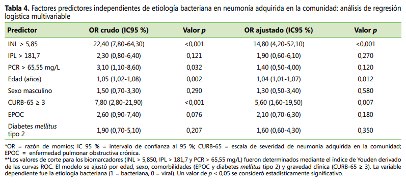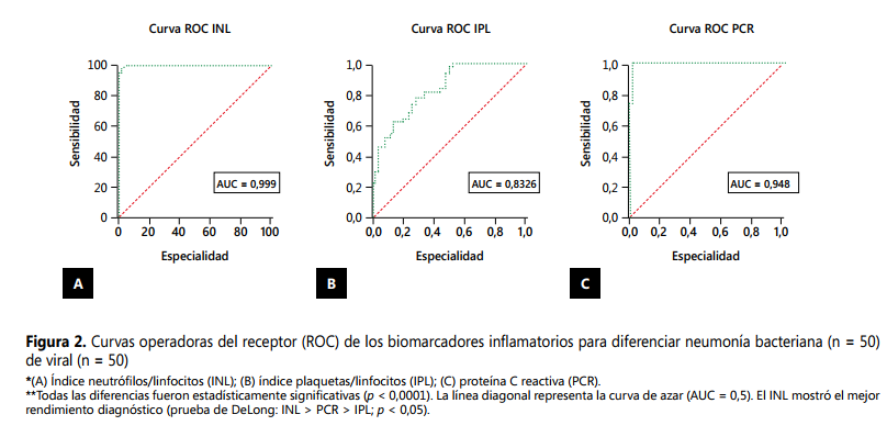 La capacidad diagnóstica de los biomarcadores fue evaluada mediante curvas ROC, calculando el área bajo la curva (AUC), el intervalo de confianza del 95 % y el punto de corte óptimo mediante el índice de Youden. Las diferencias entre AUC fueron determinadas con la prueba de DeLong. Así mismo, fueron calculadas: sensibilidad, especificidad, razones de verosimilitud positiva y negativa. Finalmente, fue aplicada una regresión logística binaria y multivariable para identificar predictores independientes de neumonía bacteriana, ajustando por edad, sexo, puntaje CURB-65, enfermedad pulmonar obstructiva crónica y diabetes mellitus tipo 2. Previo a la construcción del modelo de regresión logística multivariable, fue evaluada la posible colinealidad entre las variables inflamatorias incluidas mediante el cálculo del factor de inflación de la varianza (variance inflation factor, VIF). Fue considerado indicativo de colinealidad relevante un valor de VIF ≥ 5. En el presente estudio, todas las variables incorporadas en el modelo mostraron valores de VIF inferiores a 2, lo que permitió descartar la presencia de colinealidad significativa y justificar su inclusión simultánea en el análisis multivariable. Fueron considerados significativos los valores de p < 0,05.