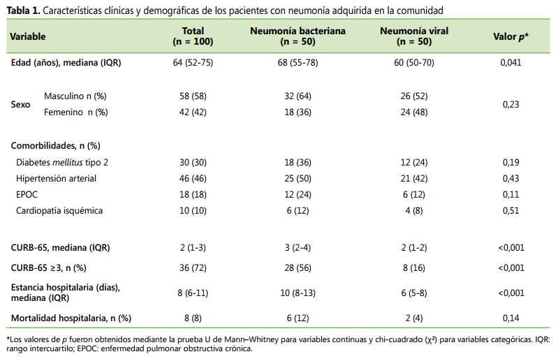 La mediana de edad era de 64 años (IQR: 52-75), significativamente mayor en la neumonía bacteriana que en la viral (p = 0,041). No se observaron diferencias en la distribución por sexo. Las comorbilidades más frecuentes fueron hipertensión arterial (46 %) y diabetes mellitus tipo 2 (30 %), sin diferencias significativas entre grupos.