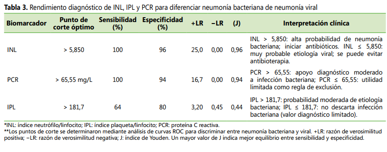 El índice neutrófilo/linfocito mostró el mejor rendimiento diagnóstico para diferenciar neumonía bacteriana de viral en pacientes hospitalizados con NAC, superando a la PCR y al IPL. Estos biomarcadores, accesibles y de bajo costo, pueden apoyar la toma de decisiones clínicas y la racionalización del uso de antibióticos, particularmente en entornos con acceso limitado a pruebas microbiológicas. No obstante, su implementación clínica requiere validación prospectiva multicéntrica antes de su adopción rutinaria.