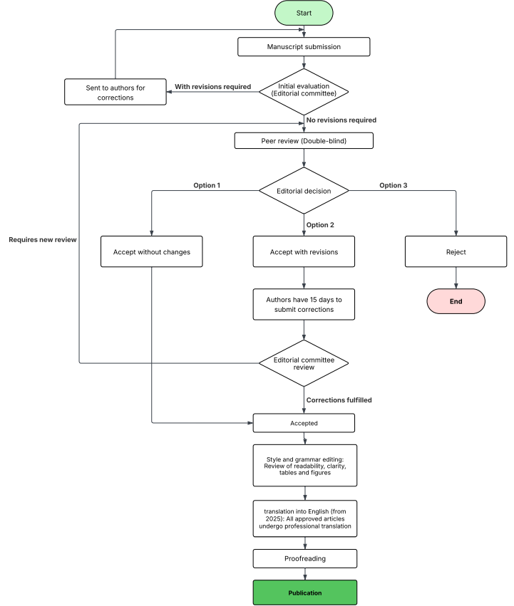 The type of review is double-blind, the reviewers issue their rating and send suggestions and recommendations to improve the article. Once the qualification, suggestions and recommendations of the reviewers are received, the Editorial Committee will decide the following: approve its publication, do not approve it or send the observations it considers pertinent to be absolved by the authors.