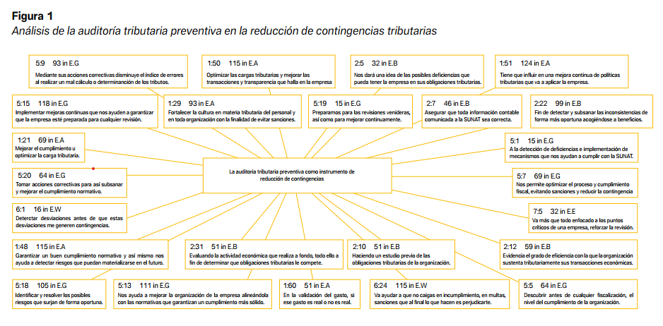 La red evidencia que el gerente, la asistente externa y los cuatro expertos concordaron en que la auditoría tributaria preventiva es un proceso que influye positivamente, siendo esta de regularidad anual, semestral o trimestral, mediante la evaluación del marco normativo, los controles internos, el grado de cumplimiento tributario y la detección de las deficiencias; proporciona un panorama sobre la gestión tributaria de la organización, que concede la oportunidad de subsanar oportunamente infracciones evidenciadas bajo el régimen de gradualidad, perfecciona el cumplimiento normativo, agiliza las cargas tributarias y permite elaborar políticas y lineamientos, proponiendo medidas correctivas para una mejora continua, con el propósito de prever contingencias tributarias, aminorar riesgos y preparar para fiscalizaciones que puedan afectar negativamente a una organización.