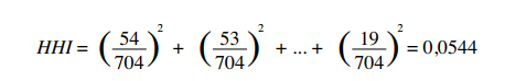 De igual manera, aplicando el HHI se consideró el total de puntos acumulados por los 20 equipos de la Liga 1, obteniendo un resultado de PT = 704.