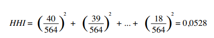 Así mismo, mediante la aplicación del HHI se tuvo en cuenta los puntos acumulados por 20 equipos de la Liga 1, obteniendo el resultado de PT = 564.