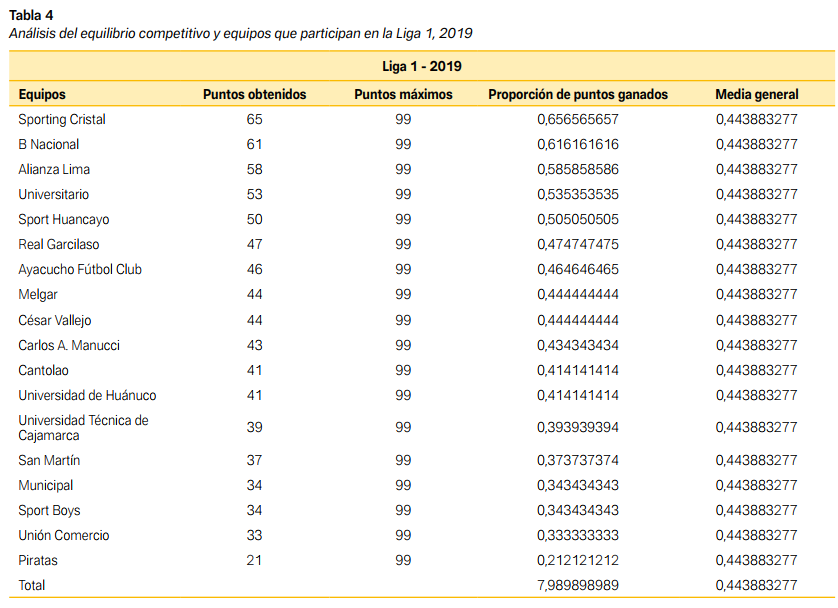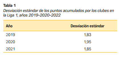 Los resultados fueron mayores a 1, lo cual confirma la hipótesis de que no existía equilibrio competitivo, es decir, los valores mayores a 1 reflejan falta de equilibrio competitivo. Los datos revelan además que la desviación estándar fue de 1,83 en 2019; 1,95 en 2020 y 1,85 en 2021, lo que indica una variabilidad significativa en el rendimiento de los equipos a lo largo de estos años.