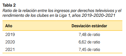Por lo tanto, el presente estudio muestra un patrón de desigualdad que refleja el estudio de Montes y Sala (2020). Para los autores, la Liga española de fútbol de Primera División también evidencia una desigualdad significativa. Entre los argumentos planteados que explican esto, el más interesante es un aumento del desequilibrio en la temporada 2009-10. Es así que nuestros resultados apoyan la dependencia de los derechos de televisación por parte de los clubes peruanos, pues representa más del 50 % de los ingresos de todos los clubes. De igual manera los derechos de TV son el principal factor para definir el éxito de este deporte y perjudican la competencia, ya que esta dependencia económica limita la capacidad de los clubes más pequeños para competir, lo que se traduce en resultados previsibles y una disminución del interés de los aficionados.