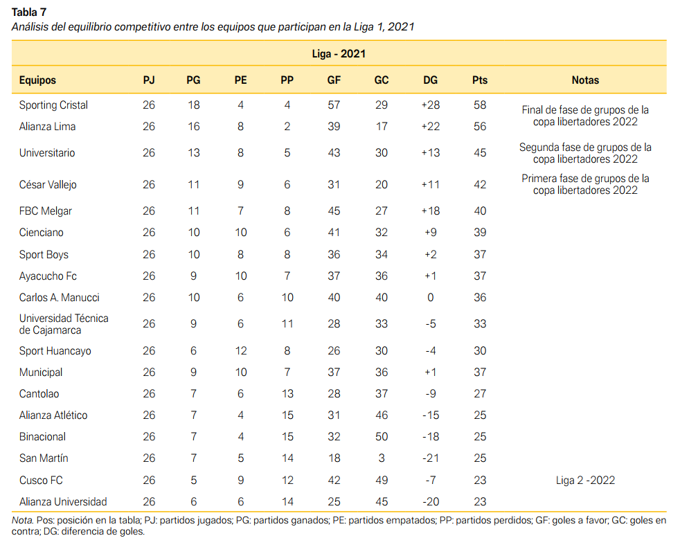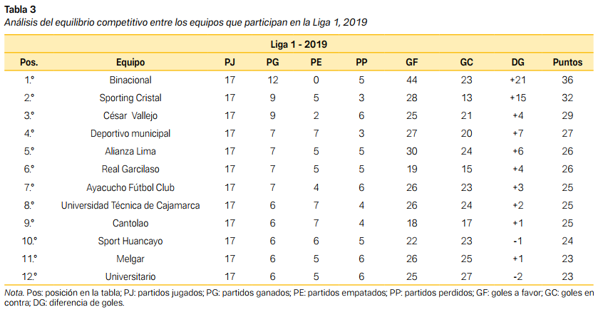 Este resultado denota un nivel moderado de concentración respecto al rendimiento deportivo en la Liga 1, e indica además que algunos equipos están acumulando una proporción considerable de los puntos totales, contribuyendo así a la desigualdad competitiva. En particular, los equipos con más recursos, como el Deportivo Binacional y el Sporting Cristal, dominan la competencia, mientras que los otros clubes, con menores ingresos por derechos de transmisión televisiva, luchan por mantenerse competitivos.