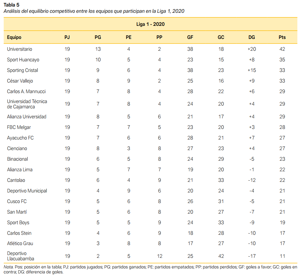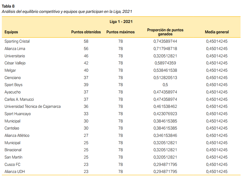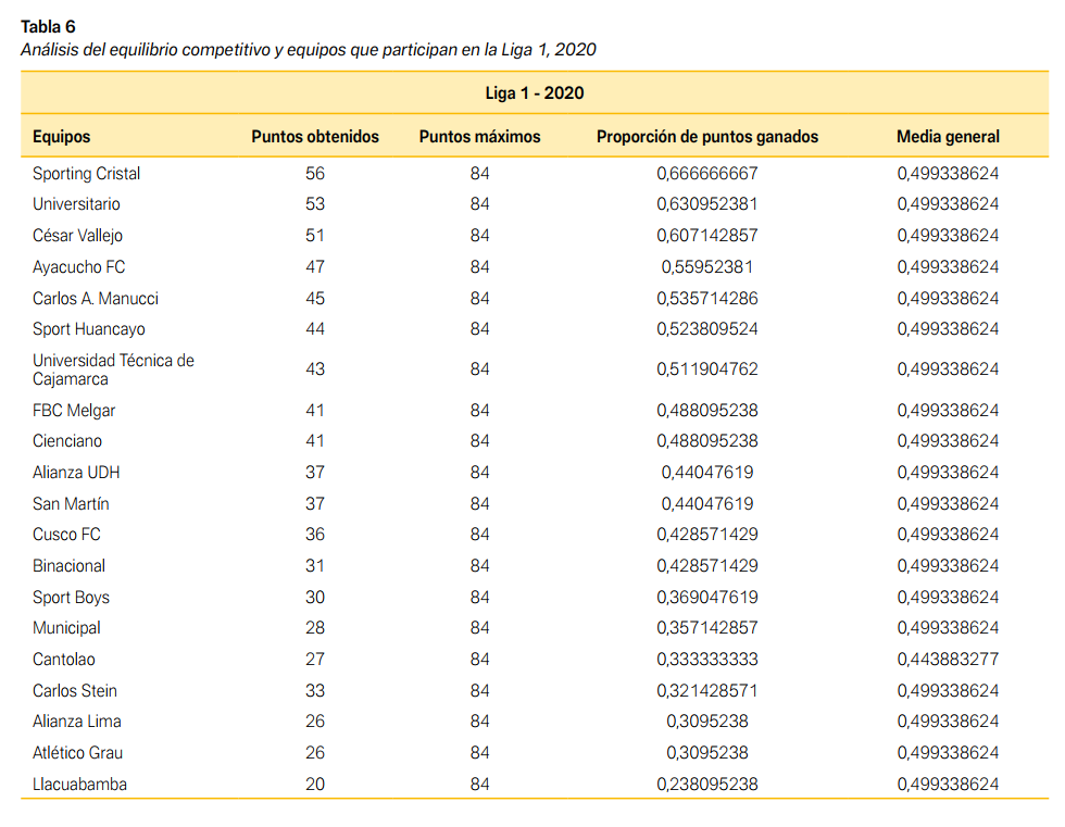 La media general de puntos obtenidos por los equipos en la Liga 1 fue de aproximadamente 38 puntos; de este modo, se puede inferir que, de promedio de la Liga 1, los equipos no alcanzaron el mismo rendimiento que la temporada anterior. Esto puede deberse a las dificultades logísticas o a problemas económicos con los que se vieron enfrentados los clubes a causa de la pandemia, sumado al nuevo formato, que disminuyó la movilidad administrativa (ver Tablas 5 y 6).
