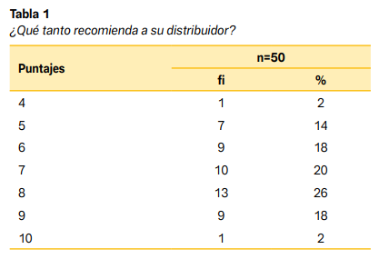 La estadística del procesamiento de la muestra de cincuenta encuestas en el software SPSS versión 29 identificó una media general de 7.16 en 10 de nivel de recomendación del proveedor de servicios. Este valor se redujo a una percepción global moderadamente favorable. Sin embargo, al realizar la categorización NPS, se observó que solo el 20 % de los encuestados pudieron describirse como promotores, mientras que el 34 % representó el comportamiento de los detractores. Además, se identificó una frecuencia significativa de respuestas recopiladas en siete puntos, lo que hace que la posición general sea neutral hacia el servicio analizado (ver Tabla 1 y Figura 1).