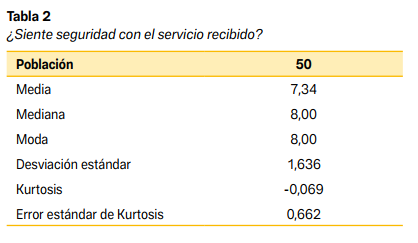 El análisis estadístico arrojó una media de 7.34, lo que indica que, en general, los participantes tenían una percepción positiva sobre la seguridad del servicio. También, la mediana y la moda, ambas iguales a 8.00, indican que más de la mitad de los estudiantes encuestados dieron puntajes altos, lo que sugiere una apreciación extendida de confianza, en términos de seguridad, en el servicio técnico encargado a los procesos clínicos en el campo de la radioterapia.