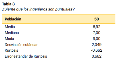 Por otro lado, la curtosis arrojó un valor de -0.667, con un error estándar de 0.662, lo que demuestra una distribución platicúrtica. Este acercamiento numérico certifica un gran esparcimiento de las respuestas en torno a la media, sin una marcada concentración de estas en valores extremos, hecho que consolida la tesis sobre la inexistencia de una misma percepción de la puntualidad del servicio técnico.