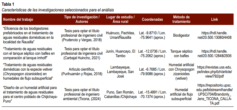 Se realizó una búsqueda sistemática entre abril y junio de 2024 en bases de datos como Scopus, Google Scholar, Redalyc y SciELO. Se utilizaron palabras clave combinadas con operadores booleanos (“tratamiento de aguas residuales” AND “zonas rurales” AND “Perú”). Inicialmente se identificaron cuarenta y ocho estudios; tras aplicar los criterios de inclusión (publicaciones entre 2015 y 2024, estudios aplicados al contexto rural peruano, acceso abierto y con datos técnicos sobre eficiencia, costo o instalación), quedaron doce estudios elegibles. Finalmente, se seleccionaron cuatro investigaciones (tres tesis y un artículo científico) por su mayor relevancia técnica y disponibilidad de información (Tabla 1). Este proceso se resume en un diagrama de flujo tipo PRISMA simplificado, que muestra las etapas de identificación, cribado, elegibilidad e inclusión según el flujo mostrado en la Figura 1 (Corona Martínez y Fonseca Hernández, 2023).
