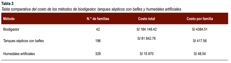 La Tabla 3 muestra que el tanque séptico tiene un costo intermedio y el biodigestor resulta el más costoso por hogar, pese a beneficiar menos familias.