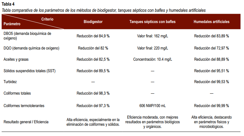 La Tabla 4 muestra que el biodigestor destaca en la reducción de sólidos y coliformes; los tanques sépticos con bafles tienen eficiencia moderada, especialmente en materia orgánica, y los humedales artificiales muestran una alta eficacia en parámetros físicos y microbiológicos, siendo la opción más completa.