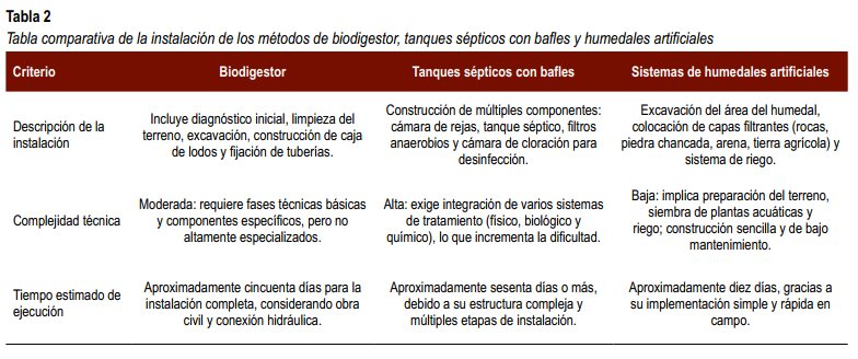 La Tabla 2 muestra que el biodigestor requiere una instalación moderada en cincuenta días; los tanques sépticos son más complejos y tardan más de sesenta días; mientras que los humedales artificiales son sencillos de instalar, con solo diez días de ejecución.