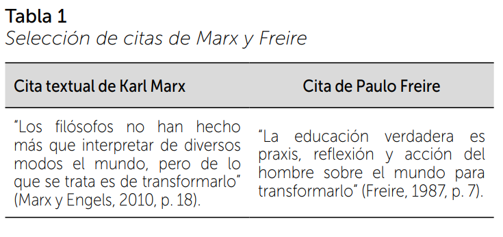 La selección se citas se realizó luego de la revisión detenida de las fuentes de los dos autores. Marx utilizó el sustantivo “transformación” en el Prólogo a la Contribución a la crítica de la economía política (2023) para describir los cambios estructurales de la sociedad, y en El Capital (1867) para explicar el papel del trabajo como agente de transformación de la propia naturaleza humana; pero, ante todo, ha introducido el verbo “transformar” en la undécima tesis sobre Feuerbach (Marx y Engels, 2010) para sintetizar la doctrina de la praxis como actividad histórica, capaz de modificar sustancialmente el mundo, más allá de la actitud contemplativa del idealismo filosófico. Por su parte, Freire ha utilizado el verbo “transformar” en la Pedagogía del oprimido (2023), en un texto en el que vincula reflexión verdadera y acción; en La educación como práctica de libertad (2025), donde combina los términos praxis, reflexión, acción y transformación (transformar); y en un fragmento de “Cartas a quien pretende enseñar” (Freire y Mastrángelo, 2014) utiliza el sustantivo “transformación” para señalar el papel del docente como agente de transformación social. Aunque todos los textos son importantes, el autor ha considerado representativos el texto de la undécima tesis de Marx sobre Feuerbach y el fragmento de La educación como práctica de libertad, que se muestran en la Tabla 1.