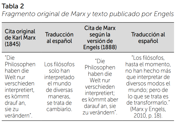 Antes de la presentación de los resultados parece significativo destacar la modificación que sufrió el texto original de Marx en manos de Engels, previo a su publicación. Entre los cambios más importantes, que condicionan la interpretación del texto, se cuentan el cambio de una coma por un punto y coma al finalizar la primera proposición, y la adición de la conjunción adversativa aber, que se traduce como “pero”, que acentúa la distancia entre interpretación y transformación.