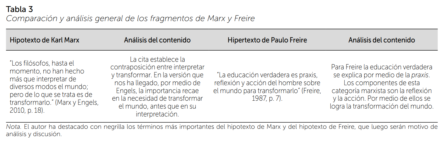 El hipertexto de Freire no contiene citas textuales ni indicios de plagio de la fuente marxista. Por el contrario, se logran identificar algunas alusiones del hipotexto marxista, entre las que se podrían mencionar el verbo “transformar” y el sustantivo “reflexión”; este último empleado como sustituto del verbo interpretar, con una carga semántica diferente. Los dos autores coinciden en el uso de los términos “mundo” y “transformar(lo)”. Adicionalmente, se debe señalar que, en el texto de Marx, se destacan los términos “interpretar”, “mundo” y “transformar”, mientras que en el texto de Freire sobresalen los términos “praxis”, “reflexión”, “acción”, “mundo” y “transformar”.